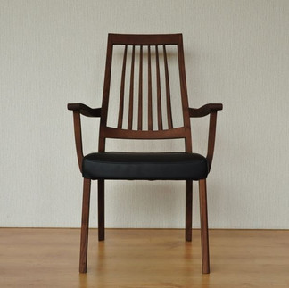 後ろから見た姿が素敵です。 家具全般に言えることかと思いますが、いい商品は、後ろ姿も素晴らしいです。 樹種としましては、オーク無垢材に、ウォールナット色の塗装をしています。 ウォールナット材は、硬い木ですので、このような曲げ方はできません。 オーク材は、曲げ木の技法に適していて、強度、耐久性、木目の美しさに秀でています。 ウォールナットのテーブルと合うように、そのオーク材に、 ウォールナット色で塗装しています。 すっきりしていて、モダンなデザインです。 同時に、流線的な優しい曲線を描いていて、エレガントな印象もあります。 モダンとか、クラシックとか、一言で言い表せないような、 何とも言えない、奥深さが感じられるようなデザインといえます。